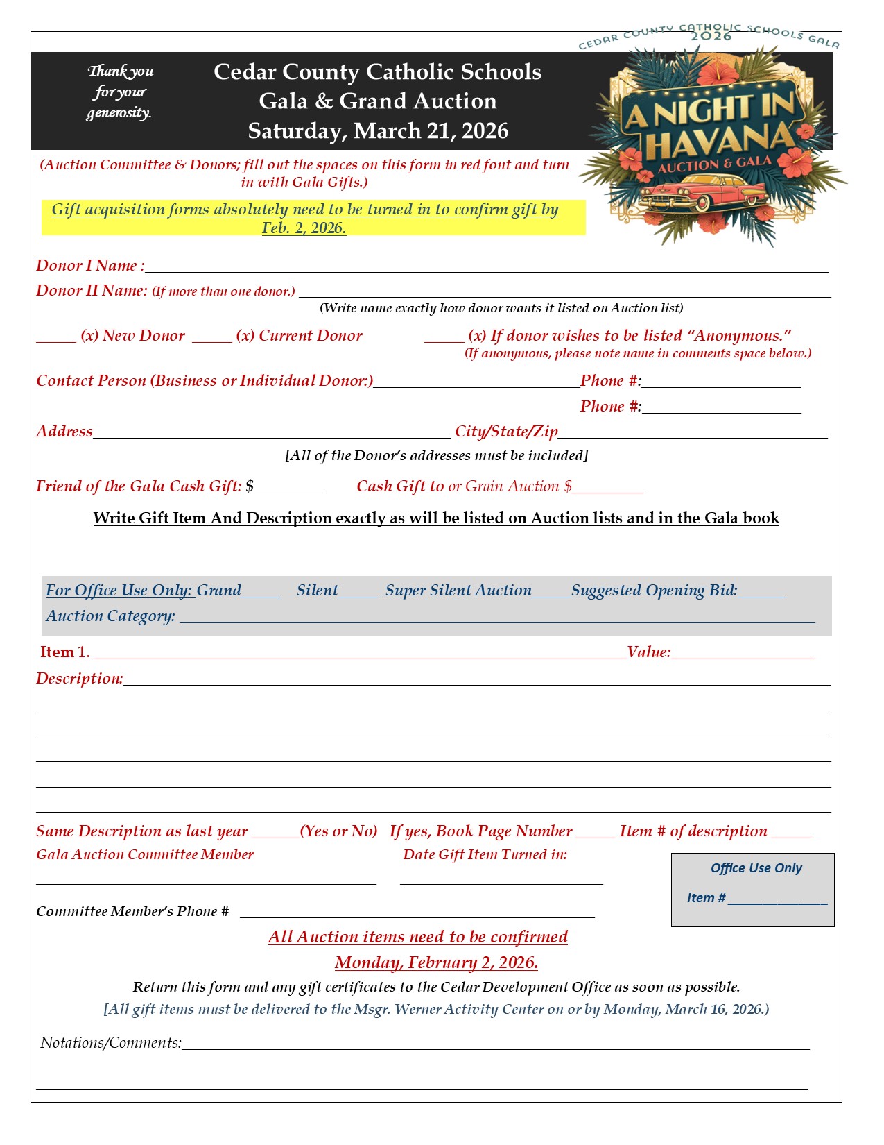 You are invited to yet give a gift to Gala 2026 by filling out the auction form below and dropping off or mailing to the Catholic Development Office, PO Box 654, Hartington, NE 68739. Questions can be directed to Joani Potts, at the Development Office: 402-254-3912